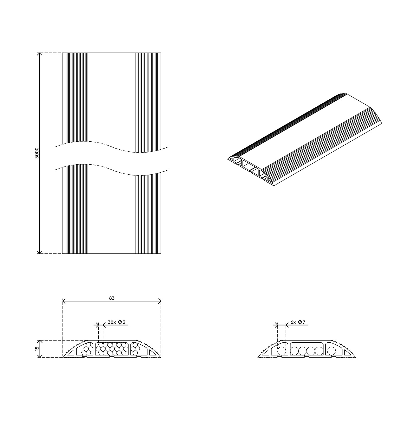 De kabelbeschermer beschermt niet alleen kabels die op de vloer liggen, maar zorgt er ook voor dat u er niet over struikelt. De kabelbeschermer heeft oplopende randen met antisliplaag en drie grote kabelgoten om data- en elektriciteitskabels van elkaar te scheiden vanwege interferentie.