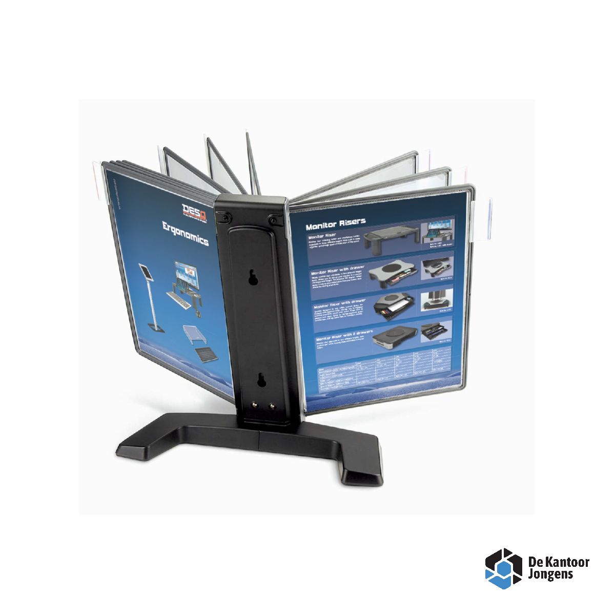 Bureau standaard met 10 display panelen geschikt voor 20 vel A4, inclusief 10 kunststof ruiters met blanco insteekkaartjes. Uit te breiden tot 20 of 30 display panelen met behulp van de wandhouder en uitbreidingsmodule.