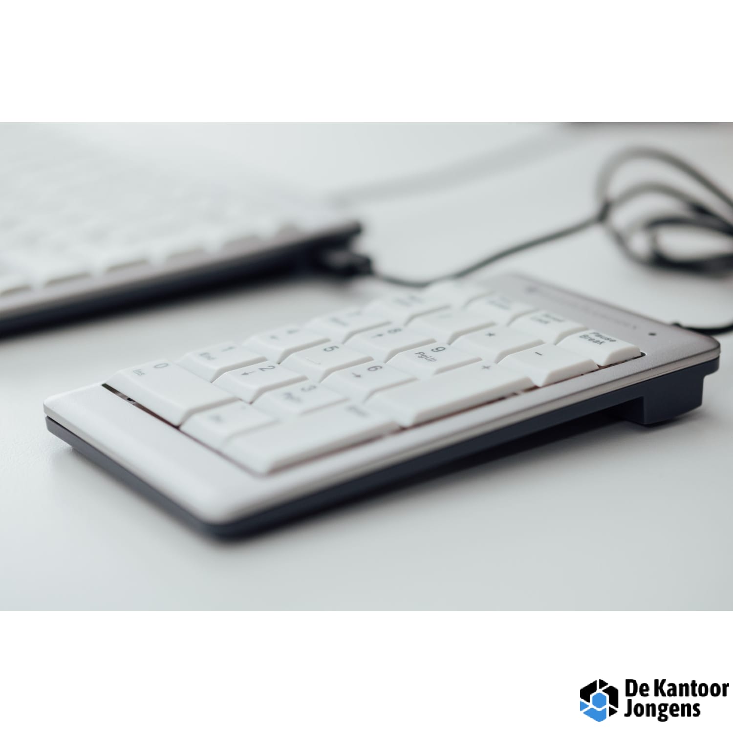 Het UltraBoard 955 Numeric is een perfecte aanvulling op jouw compacte toetsenbord als je regelmatig grote hoeveelheden getallen invoert. Om de spieractiviteit van beide handen in evenwicht te brengen, kan je gemakkelijk afwisselen tussen links- en rechtshandige gegevensinvoer, en dit verhoogt zowel comfort als productiviteit. Dit externe numerieke toetsenbord heeft een schaarmechanisme, een hartafstand van de toetsen van 19 mm en holle toetsen in wit met donkere letters. Al deze kenmerken zorgen voor een comfortabele en nauwkeurige manier van gegevensinvoer, wat leidt tot minder fouten. Vier praktische sneltoetsen, geïntegreerde navigatietoetsen, een LED-indicator voor aan en uit, en uitklapbare voetjes, zijn geweldige eigenschappen, die het UltraBoard 955 Numeric de perfecte aanvulling voor bijvoorbeeld het UltraBoard 950 maakt.