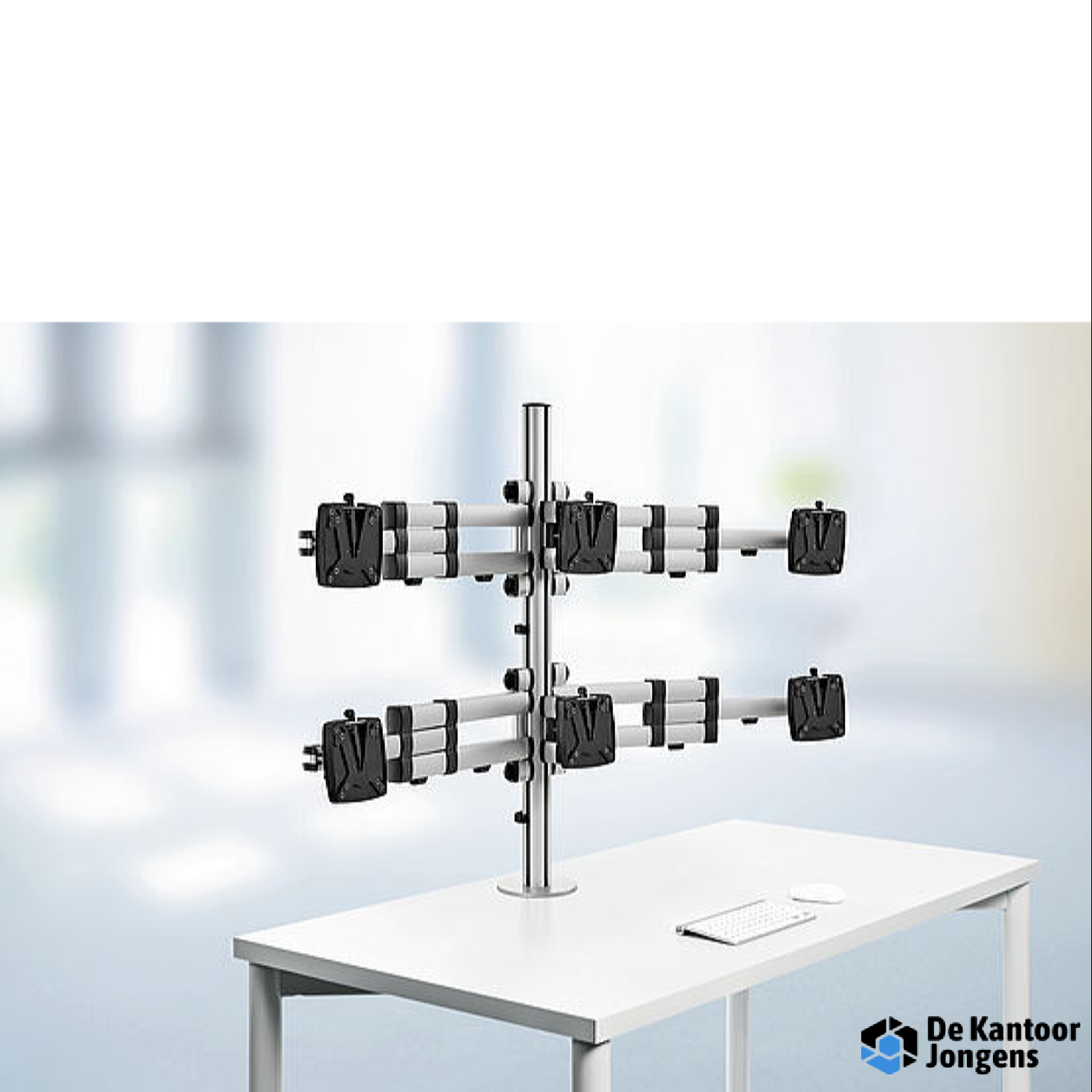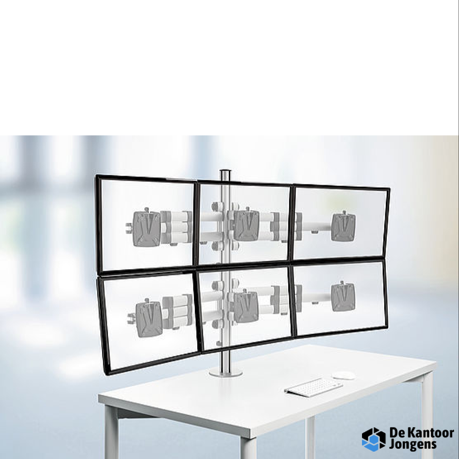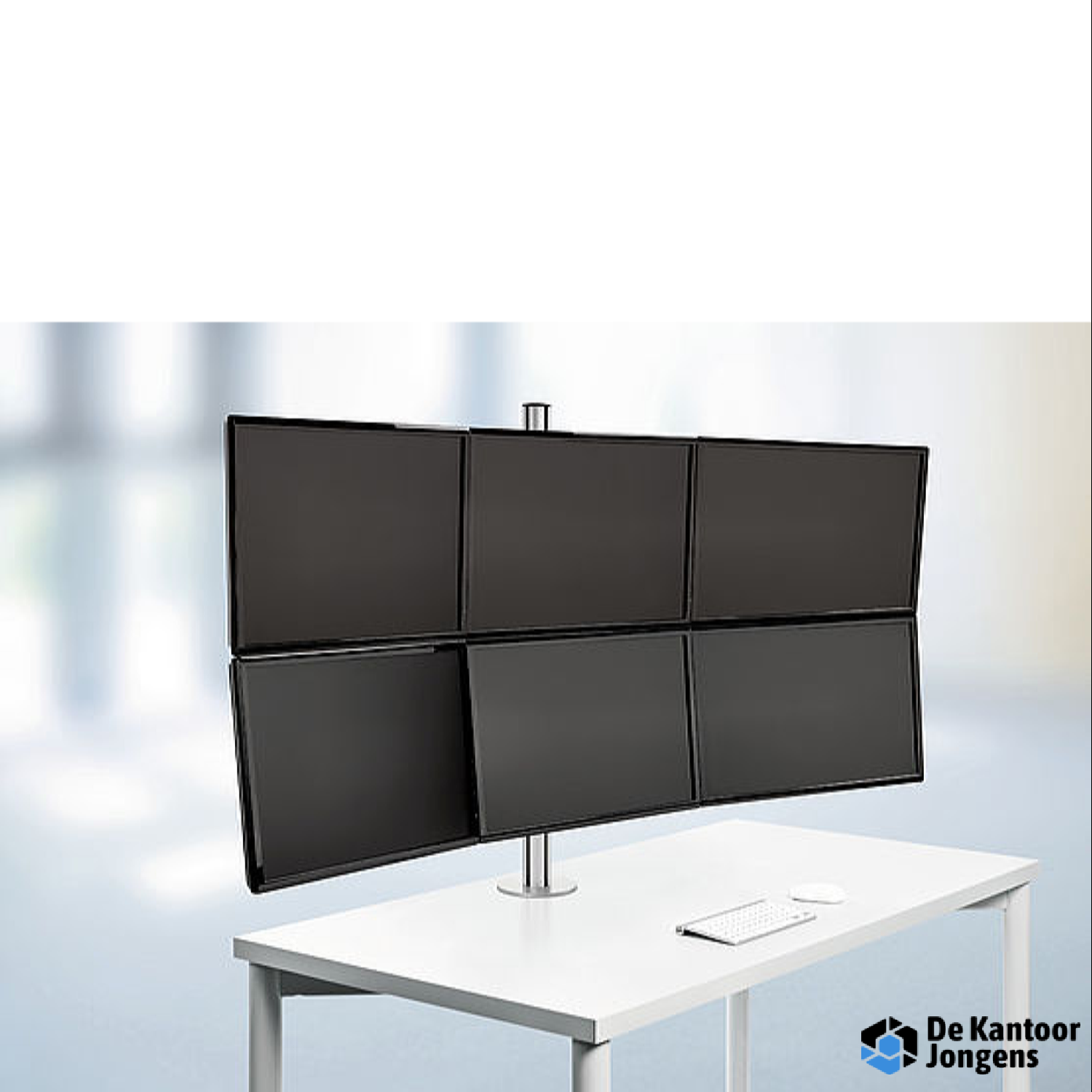 De stabiele set voor de bevestiging van zes beeldschermen op de werkplek, voor aanzienlijk hogere productiviteit.