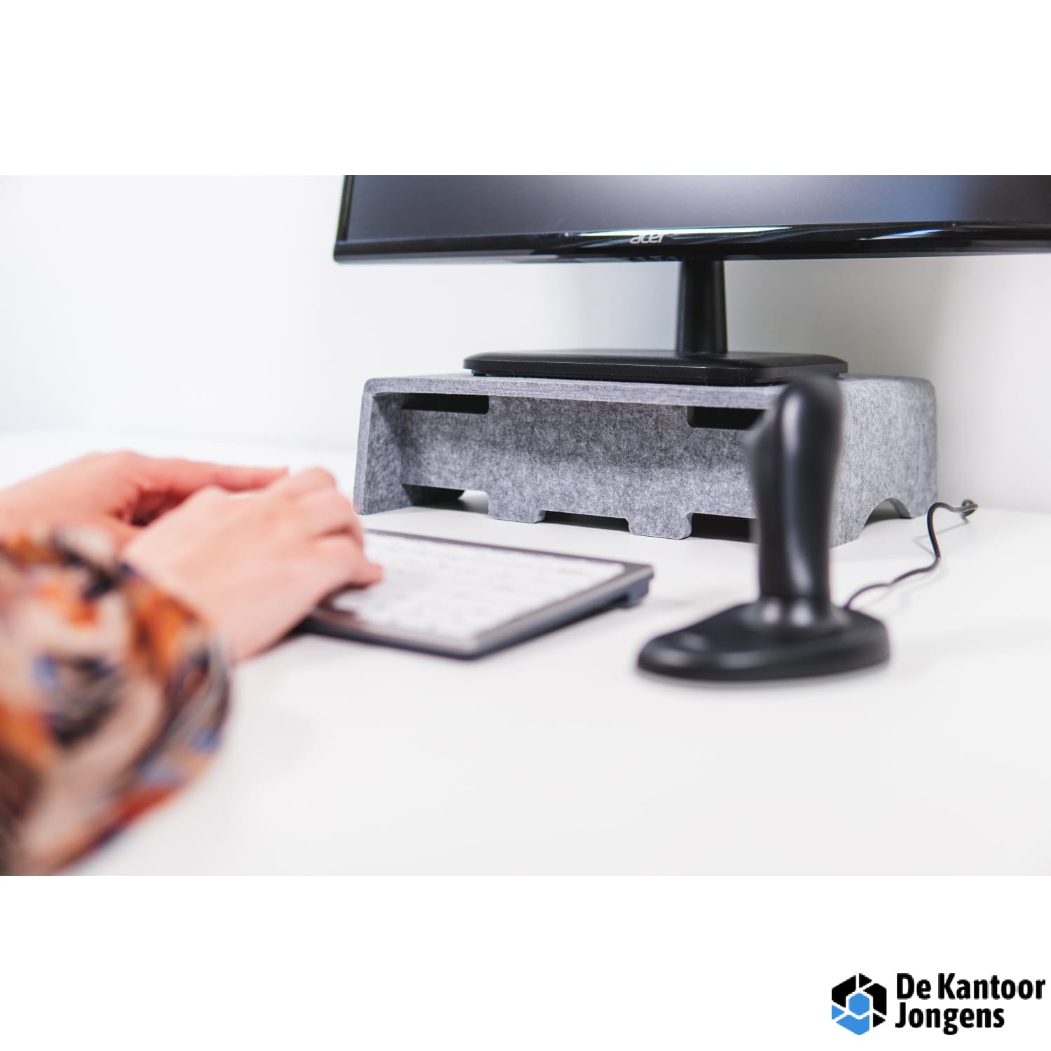 De Q-Riser 90 Circular monitorstandaard brengt jouw monitor op de juiste kijkhoogte. Tegelijkertijd is deze monitorstandaard gemaakt van gerecycled materiaal. Dit monitorstandaard combineert ergonomie en duurzaamheid in één product. Zo werk je automatisch in een rechte houding. Gebruik hem op jouw vaste werkplek op kantoor of thuis. Hij heeft geïntegreerd kabelmanagement, is geschikt voor flatscreens tot 17 inch en is gemaakt van zeer stabiel PET-vilt materiaal, wat de Q-Riser 90 monitorstandaard compleet maakt. Met deze monitorstandaard verbeter je jouw werkhouding en verhoog je jouw productiviteit op het werk en lever je een goede bijdrage aan het milieu.