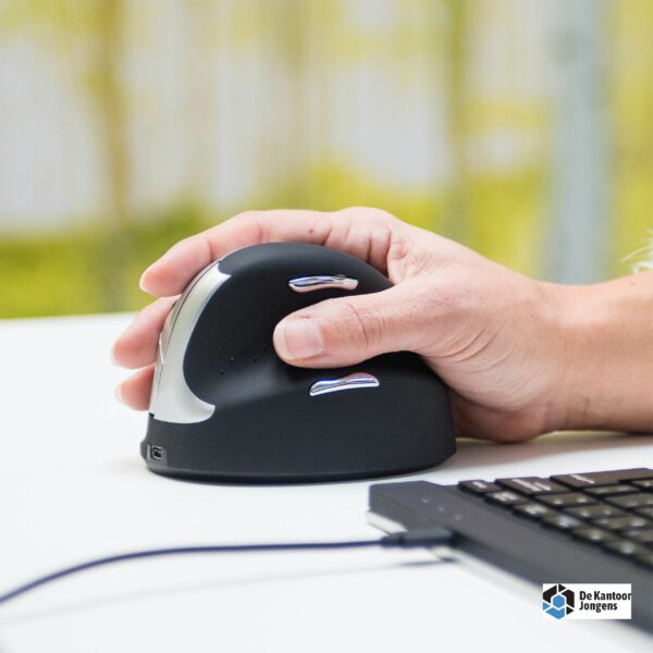 De ergonomische R-Go HE muis heeft een ronde vorm die zorgt voor een natuurlijke, ontspannen stand van je hand en pols. De verticale stand stimuleert de muisbeweging vanuit je onderarm. Op deze manier worden lichamelijke klachten zoals RSI voorkomen. De muis ligt prettig in de hand en beschikt over een duimgoot en een pinkgoot, zodat alle vingers zijn ondersteund. De ergonomische R-Go HE muis is verkrijgbaar voor links- en rechtshandig gebruik en in verschillende maten, zodat hij in elke hand past.