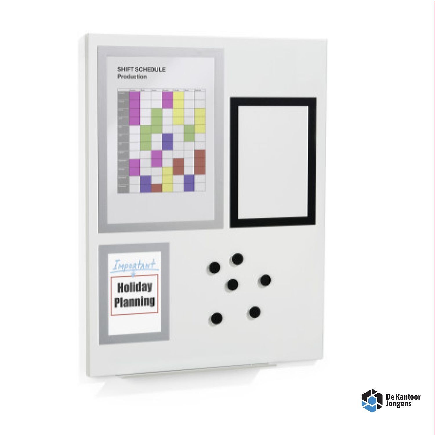 Beschrijfbaar magneetbord met afleggoot, 3 magnetische informatiekaders en 6 magneten.