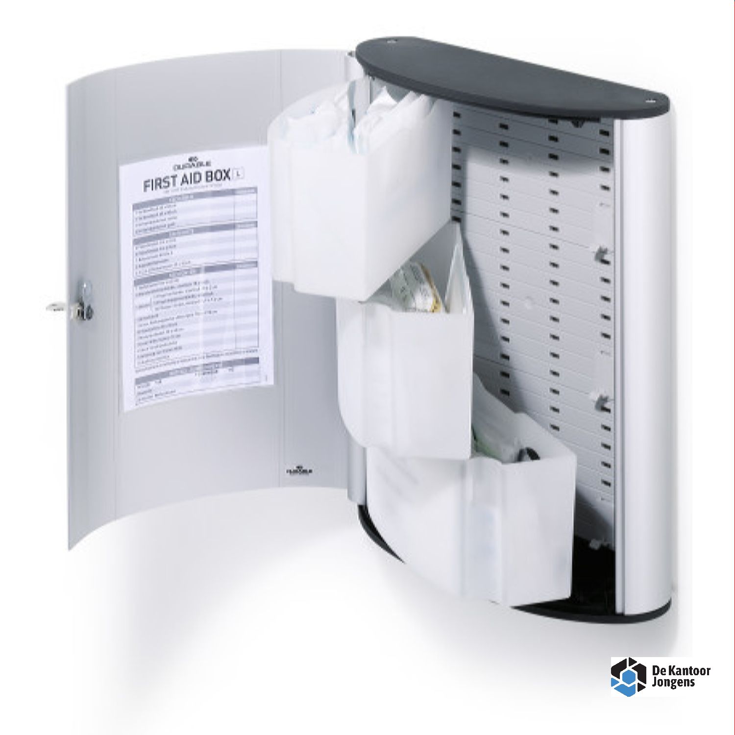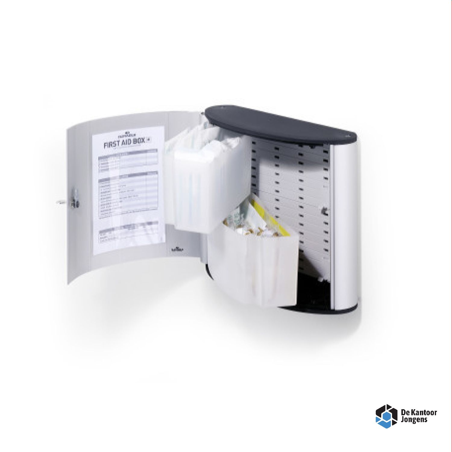 Bij een ongeval- bijvoorbeeld in het huishouden, in het bedrijf en op school- moeten de EHBO-middelen altijd beschikbaar zijn. De nieuwe FIRST AID BOX van hoogwaardig aluminium is in geval van nood eenvoudig toegankelijk en beschermt de inhoud tegen verontreinigheden, vocht en hoge temperaturen. Door het elegante design past de box uitstekend in elke moderne omgeving. Al naar gelang de grootte van de box zorgen voor twee of drie naar buiten zwenkbare vakken voor voldoende plaats voor verbandmateriaal. Bovendien zorgt een indexblad voor een overzichtelijke inhoudsopgave en biedt plaats voor het noteren van belangrijke alarmnummmers. De box kan naar keuze met een bijgevoegd wit EHBO kruis met groene achtergrond worden gemarkeerd. . Ieder EHBO-kastje is voorzien van een slot en 2 bijhorende sleuteltjes. Op die manier kunnen enkel de bevoegden tot bij de inhoud van het kastje. De standaardinhoud van de beide FIRST AID BOXEN en de complete vullingen zijn apart verkrijgbaar: FIRST AID KIT overeenkomstig DIN 13157 (administratieve en handelsbedrijven tot 50 medewerkers, productie- en verwerkingsbedrijven tot 20 medewerkers fo bouwplaatsen tot 10 medewerkers) en de FIRST AID KIT overeenkomstig DIN 13 164 (voor particulier gebruik)