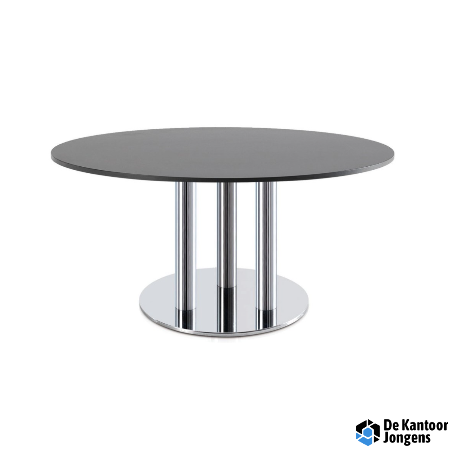Tafelonderstel met vlakke ronde voet en drie uit elkaar geplaatste kolommen, ballastplaat staal met afdekkap in poedercoat, chroom of mat rvs.