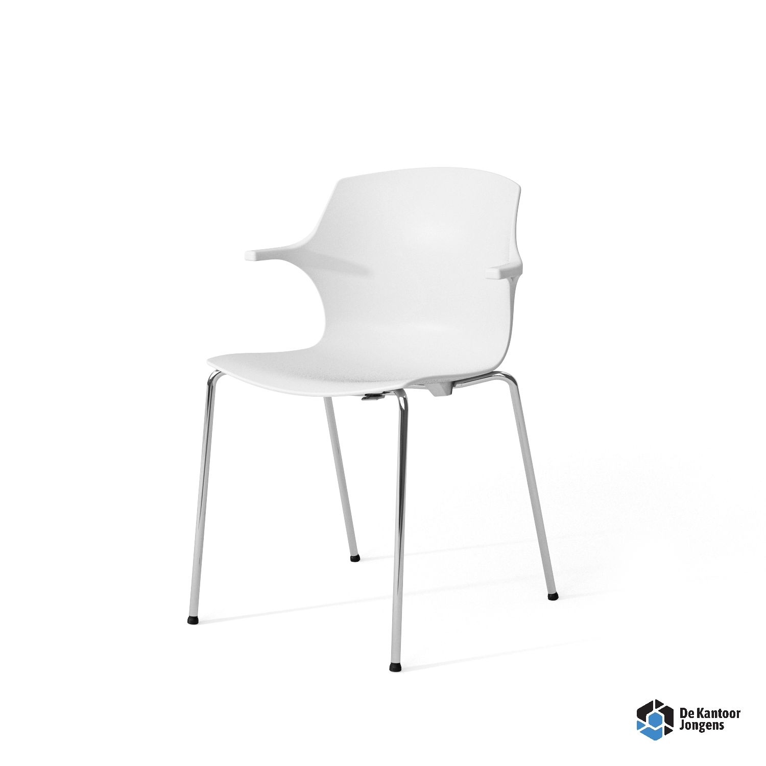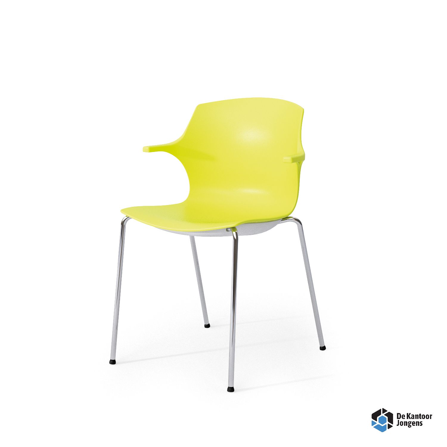 Kunststof stoel met armleggers. De stoel is aan de onderkant voorzien van een nette afwerkplaat waardoor de stoel goed stapelbaar is tot 6 stuks.
